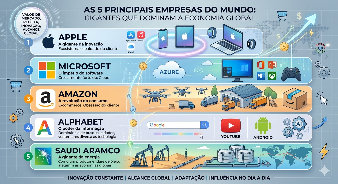 Neste artigo, você vai conhecer as 5 gigantes globais que lideram o mercado internacional, entender como elas cresceram, por que são tão poderosas e como influenciam bilhões de pessoas todos os dias.