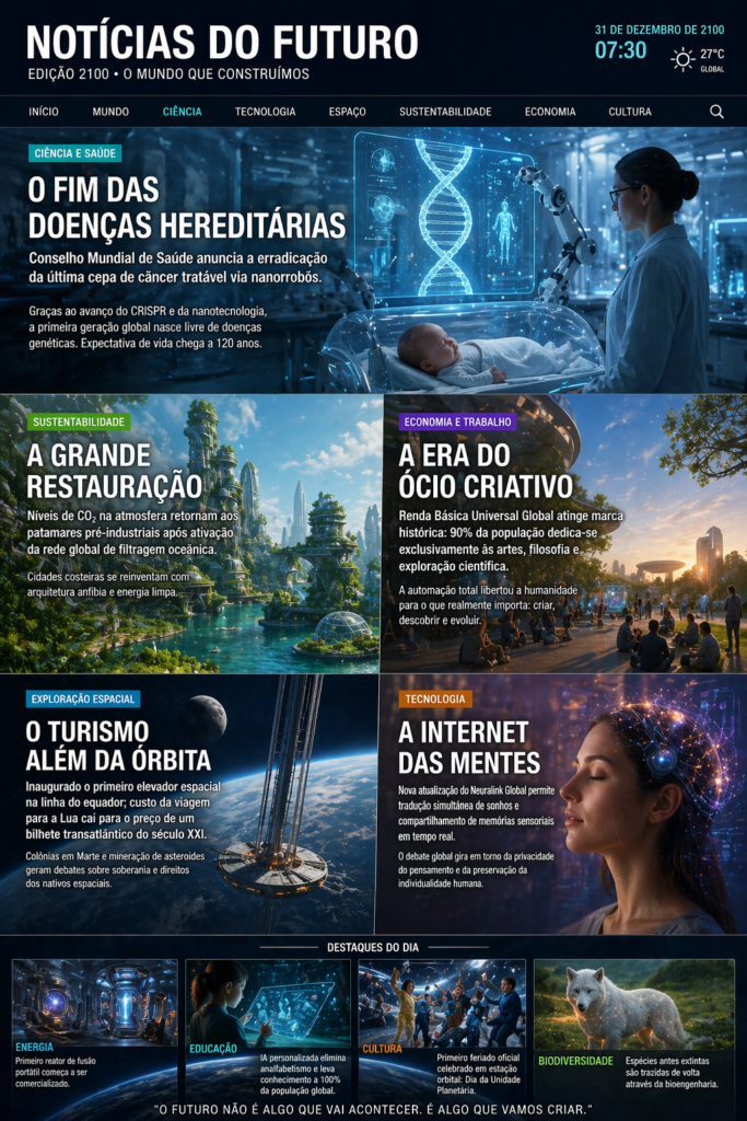 Imagine abrir o seu navegador e encontrar manchetes sobre a primeira cidade autossustentável em Marte, a cura definitiva para o envelhecimento celular ou o primeiro feriado oficial celebrado em uma estação orbital. Não estamos falando de ficção científica barata, mas de uma projeção criativa baseada nas tendências tecnológicas e científicas que estão moldando o nosso presente.