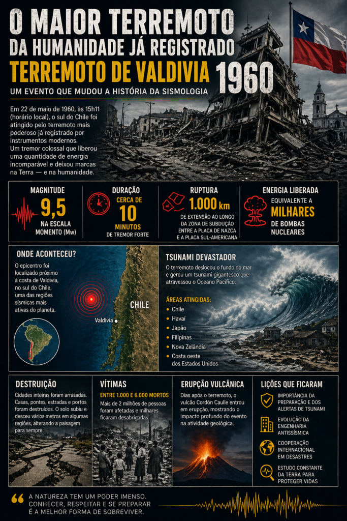 Os terremotos estão entre os fenômenos naturais mais devastadores que a humanidade conhece. Em poucos segundos, cidades inteiras podem ruir, oceanos podem se erguer em ondas gigantes e paisagens podem ser alteradas para sempre. Ao longo da história, milhares de tremores causaram destruição e mudaram o rumo de civilizações. No entanto, entre todos os eventos já medidos por instrumentos modernos, nenhum supera aquele que ocorreu no sul do Chile em 22 de maio de 1960: o Grande Terremoto de Valdivia, registrado com magnitude 9,5, o maior terremoto da história da humanidade desde o início das medições científicas.